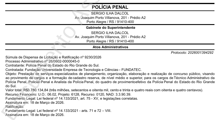 Com isso, a instituição contratada e incumbida de coordenar as etapas do certame será realmente a FUNDATEC (Fundação Universidade Empresa de Tecnologia e Ciências), a qual formalizou a sua contratação agora no dia 18 com a Polícia Penal gaúcha.